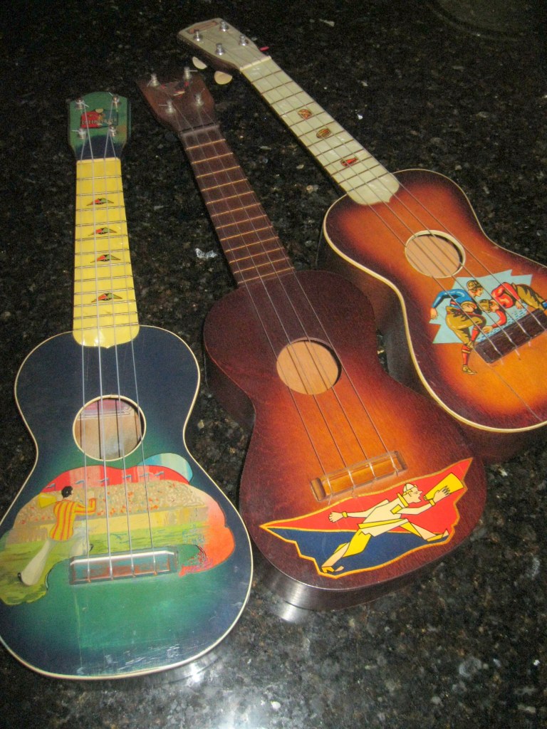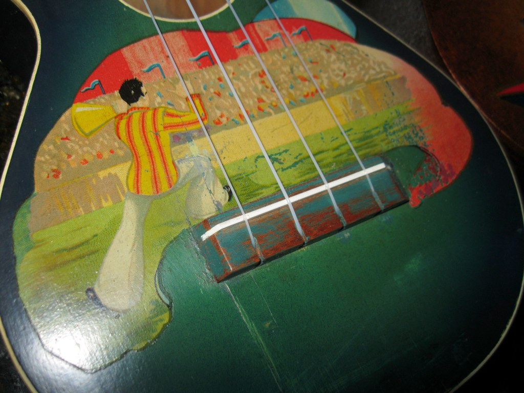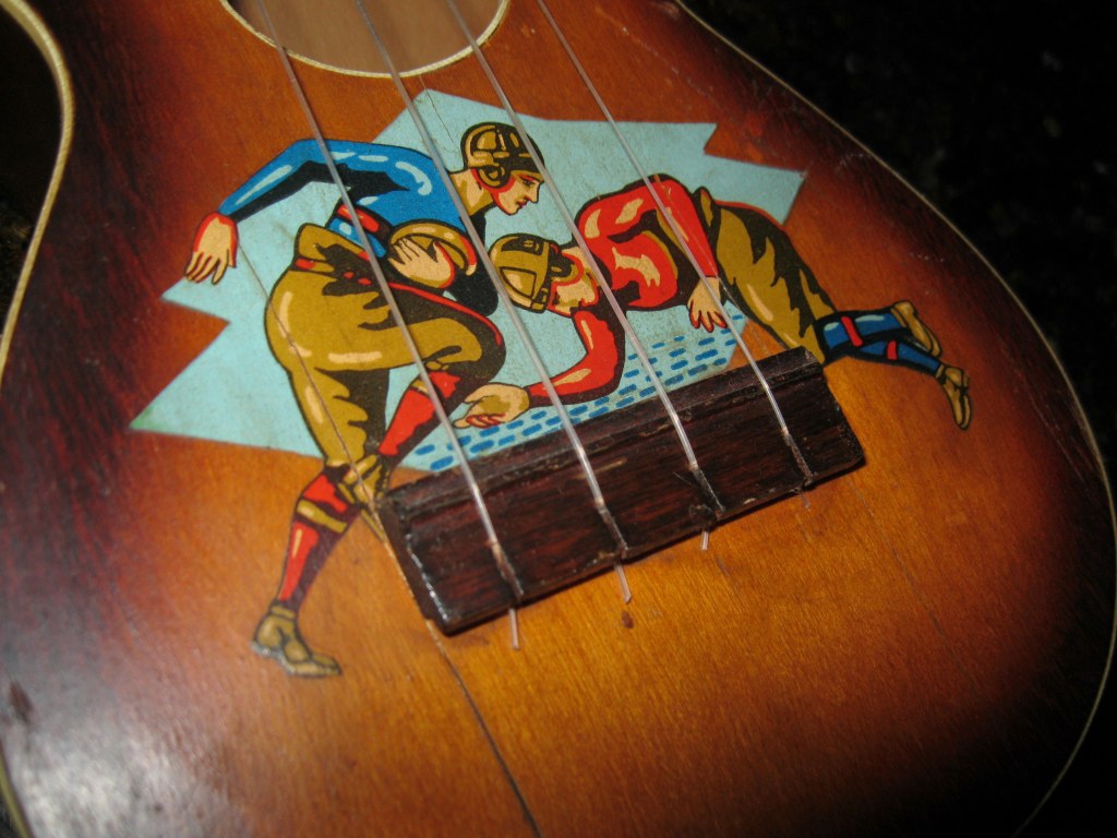 Here are three little soprano ukes from those days, one showing those “leatherheads” in action and the other two showing cheerleaders—known as “pep leaders” in those days—doing their thing. These probably sold for three or four dollars back in the 1930s. Fun to find today!