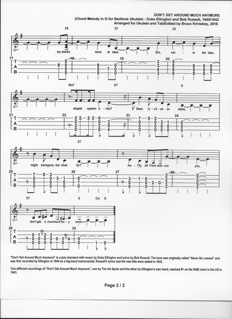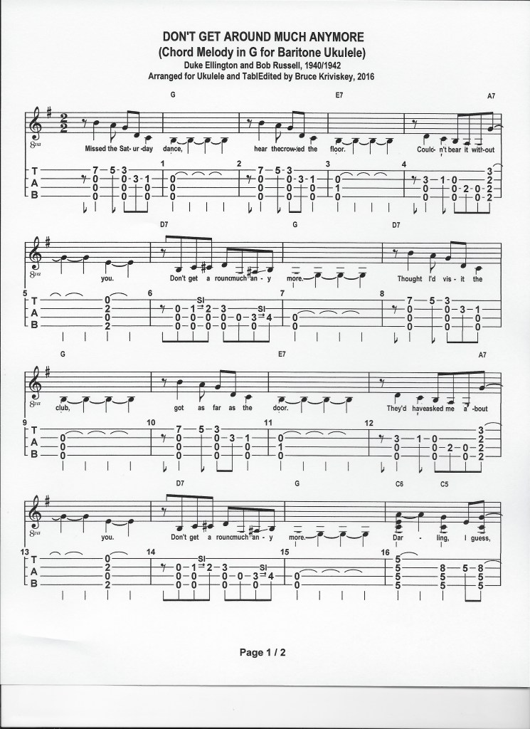 Now if you would like to give this a try at home, hopefully not too much by yourself, here is a chord melody TAB version I put together a couple of years ago. It’s set up for a DGBE-tuned baritone (or sopranino) uke but you GCEA folks can simply follow the TAB numbers and it will be in the Key of C.